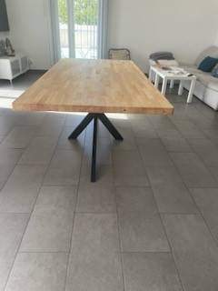 Création de pied de table mikado en fer style atelier, finition primaire antirouille noir semi brillant. Pied assorti pour le banc.
